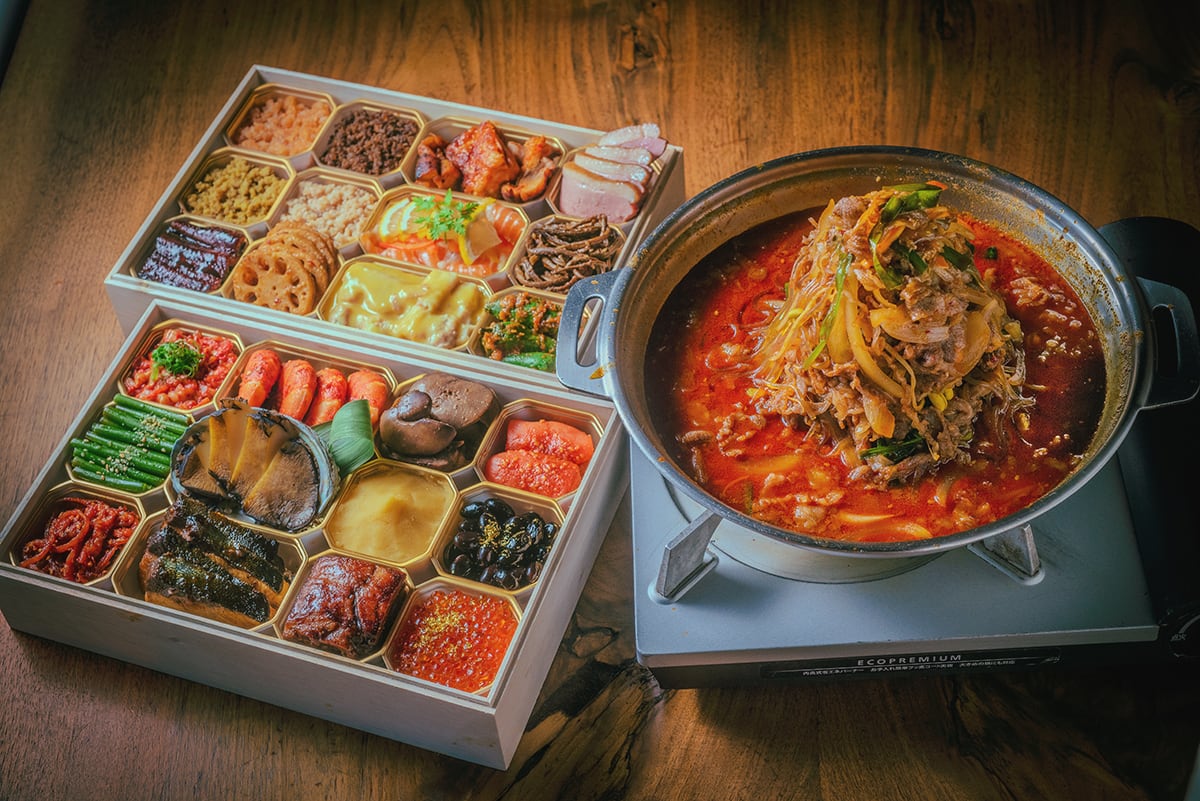 2026年李南河のおせち、今回のメインとなるお料理は、黒毛和牛の匠『牛匠かぐら』と当店店主の李南河がタイアップしてお作りします特製のプルコギ鍋です。そのメインとしてご用意させていただくお肉は、長野県産『信州プレミアム和牛』のリブロース。新年の祝いの膳に、特製のチヂミと一緒に皆様でお召し上がりくださいませ。